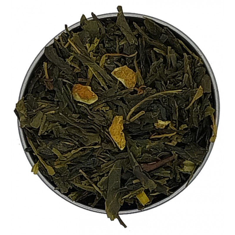 Thé vert, orange, mandarine, orange sanguine, citron, orange amère, pamplemousse, bergamote et citron vert, écorces citron et orange pétales de souci.