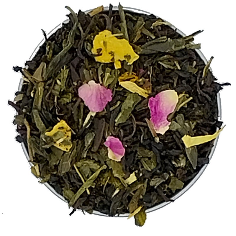 Thé vert Sencha de Chine aromatisé à la pêche, au litchi et à la rose, avec pétales.