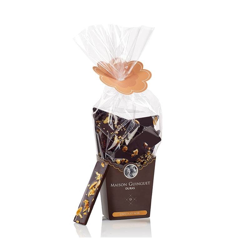 Grand classique de la Maison Guinguet, cette boitasac contient de délicieux chocolats noir parsemés de gourmandises : noisettes, amandes, cubes d’orange, cranberries, poudre de framboise, graines de sésame, biscuit et céréales.